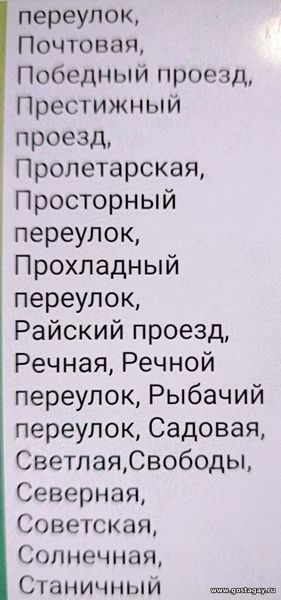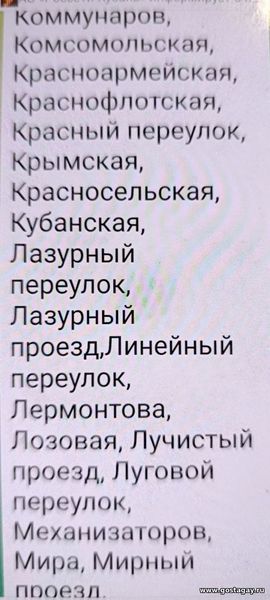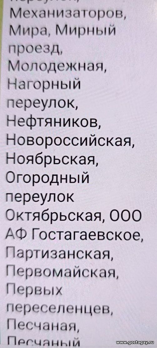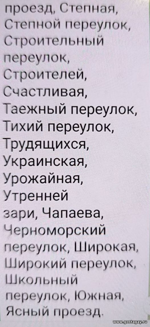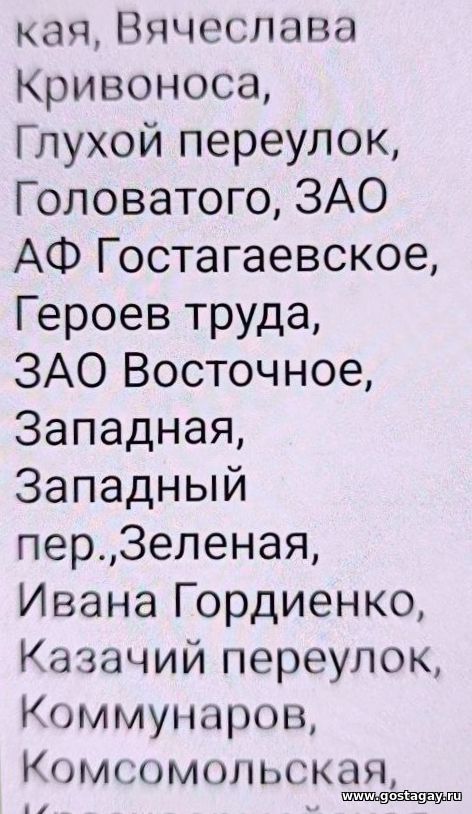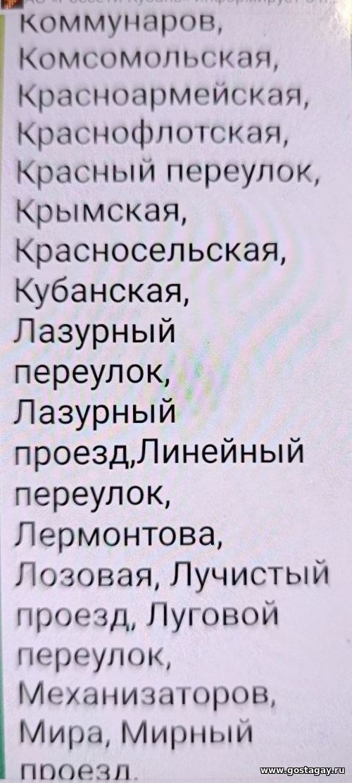 ст-ца Гостагаевская, ул. Колхозная, ул. Советская, ул. Почтовая, ул. Урожайная, ул. Мира, ул. Октябрьская, ул. Новороссийская, ул. Свободы с 09-00 до 12-00.