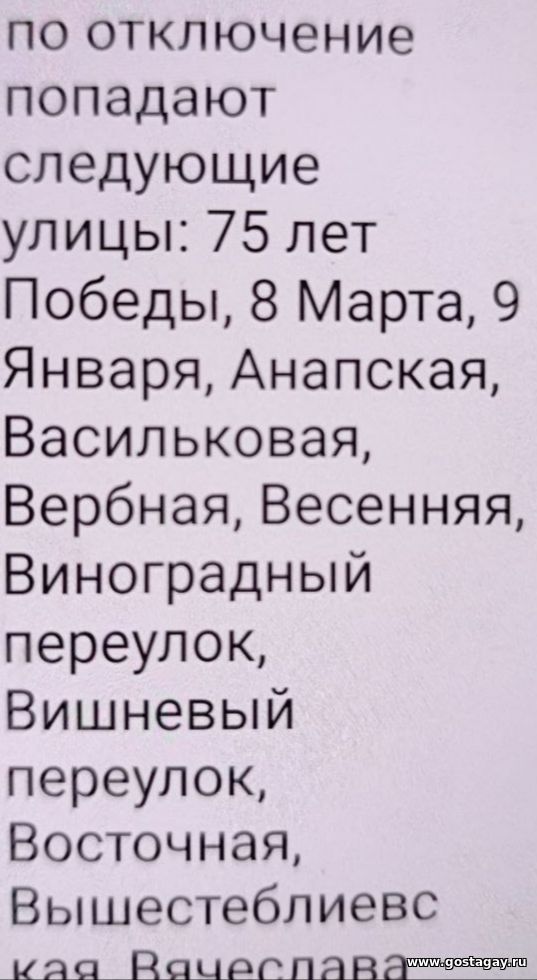ст-ца Гостагаевская, ул. Весенняя, ул. Ноябрьская, ул. Нефтяников, пер. Широкий, пер. Песчаный, пер. Черноморский, пер. Райский, пер. Таёжный, пер. Нагорный с 09-00 до 17-00.
