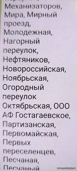 пер. Вишневый, ул. Восточная, пер. Глухой, пер. Западный, ул. Комсомольская, ул. Октябрьская, пер. Тихий, ЗАО АФ «Гостагаевское»