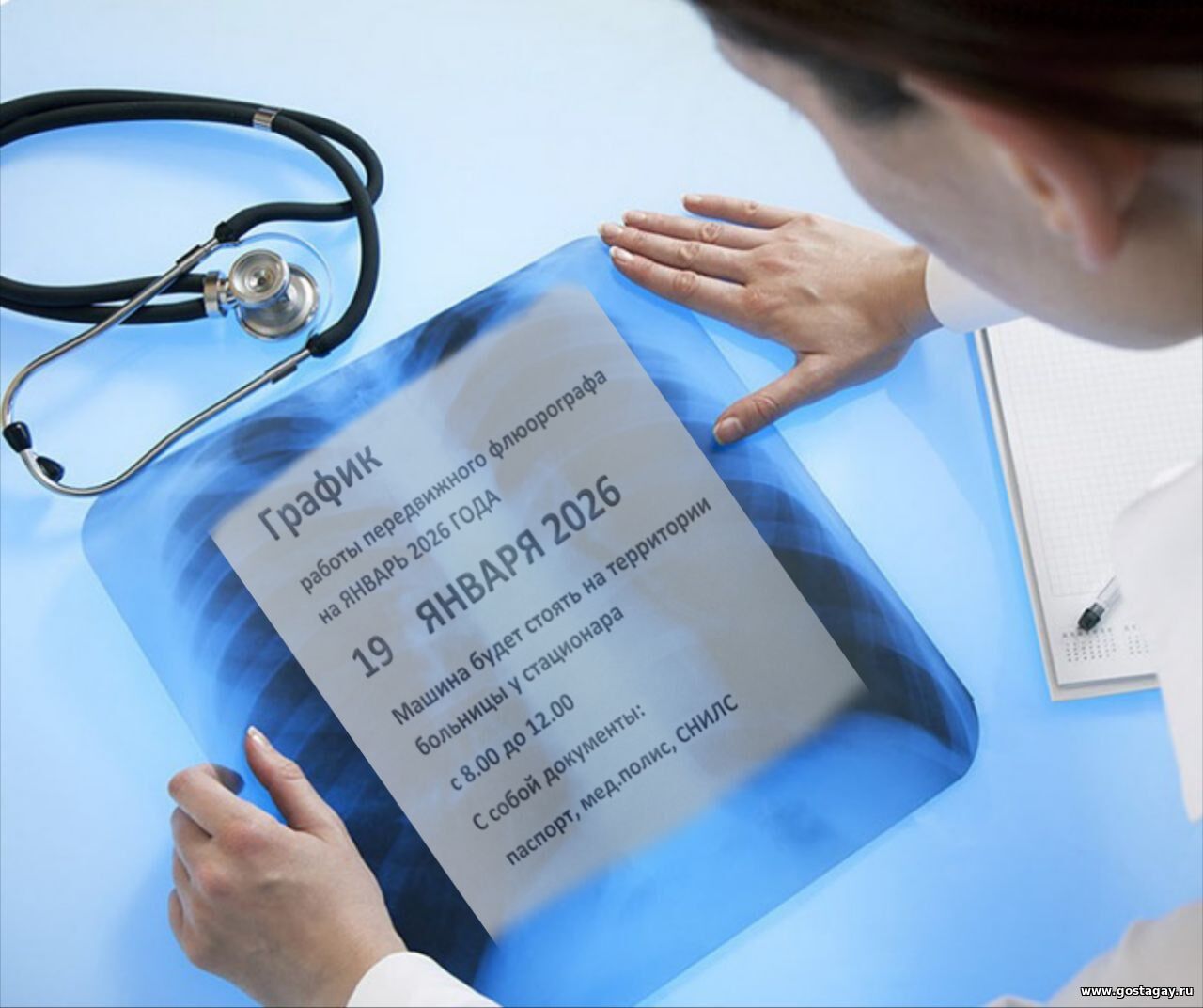 График работы передвижного флюорографа на январь 2026г. Машина будет находится у здания стационара 19.01.2026г. с 8-00 до 12-00. При себе иметь документы: паспорт, мед.полис, СНИЛС