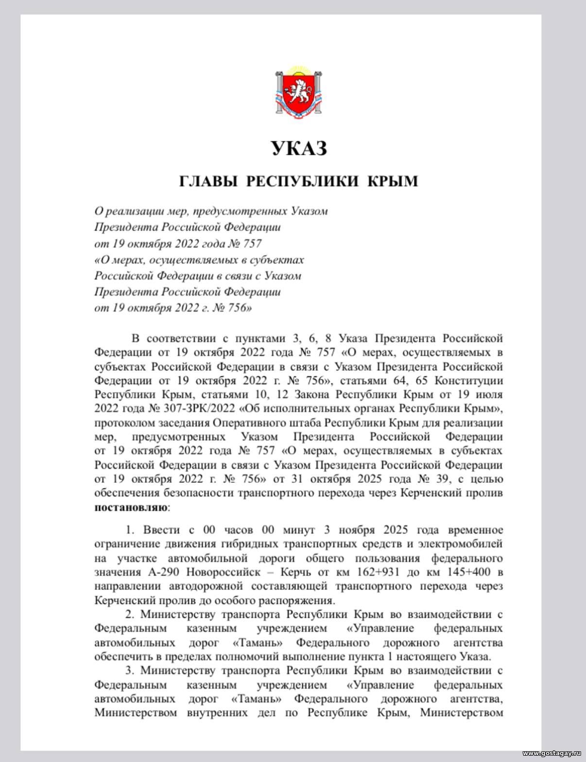 |  Глава Республики Крым подписал указ, согласно которому электромобилям и гибридным машинам запрещается ездить со стороны полуострова по Крымскому мосту.