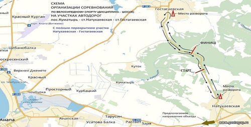 24 сентября в Анапе и Новороссийске пройдет Первенство России по велоспорту. В них примут участие более 100 юношей из 18 регионов страны. Чтобы обеспечить безопасность велосипедистов, 24 сентября с 10:00 до 15:00 будет действовать ограничение движения транспортных средств на участке автомобильной дороги: село Юровка – станица Раевская – город Новороссийск (км. 16+110 – км 17+500 от станицы Гостагаевской до станицы Натухаевской).